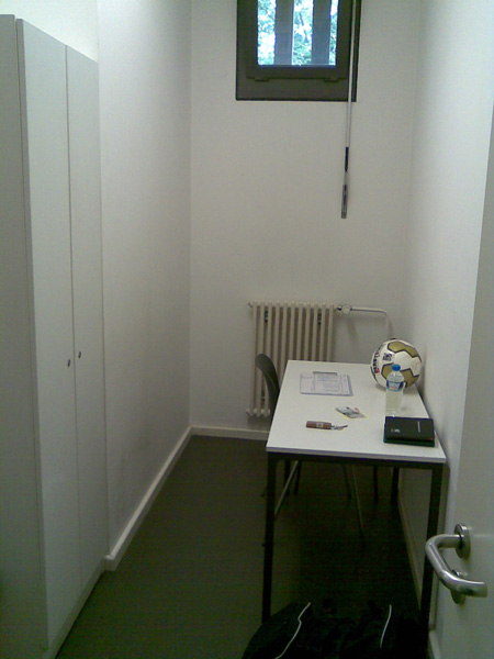 Abseits der Spielerkabinen liegt die Schiedsrichterunterbringung, die aus vier identischen, schlauchförmigen Kabinen besteht. Jede ist extra abgetrennt und verfügt über ausreichend Platz, ein Waschbecken und eine Dusche. Die Toiletten sind außerhalb des Schiedsrichterbereiches, aber nur wenige Meter entfernt direkt gegenüber, am Büro des Platzwartes. Der Luxus von vier Schiedsrichterkabinen lässt jedem Kollegen seinen eigenen Bereich, durch die Enge Anordnung wird eine Isolation voneinander aber verhindert.